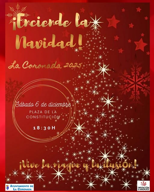 El Ayuntamiento de La Coronada se complace en anunciar que el próximo 6 de diciembre, a las 18:30 h, daremos la bienvenida oficial a la Navidad con el gran Encendido Navideño 2025 en la Plaza de la Constitución.
